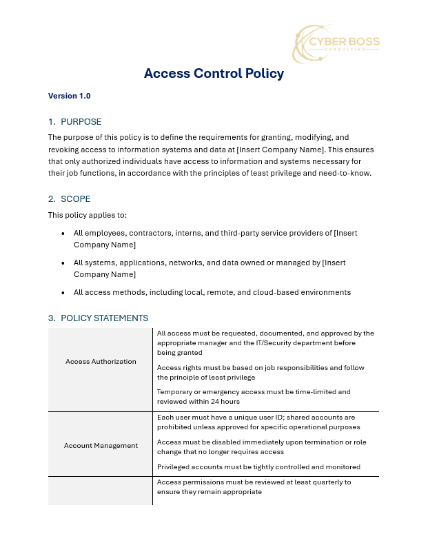Our Small Business Cybersecurity Policy Toolkit gives you 16 professionally written, fully editable policy templates designed to help small businesses quickly implement a strong cybersecurity foundation. Each policy is aligned with NIST 800-53 Rev. 5 and PCI-DSS standards, ensuring your organization meets regulatory and industry best practices without the high cost of hiring a consultant.