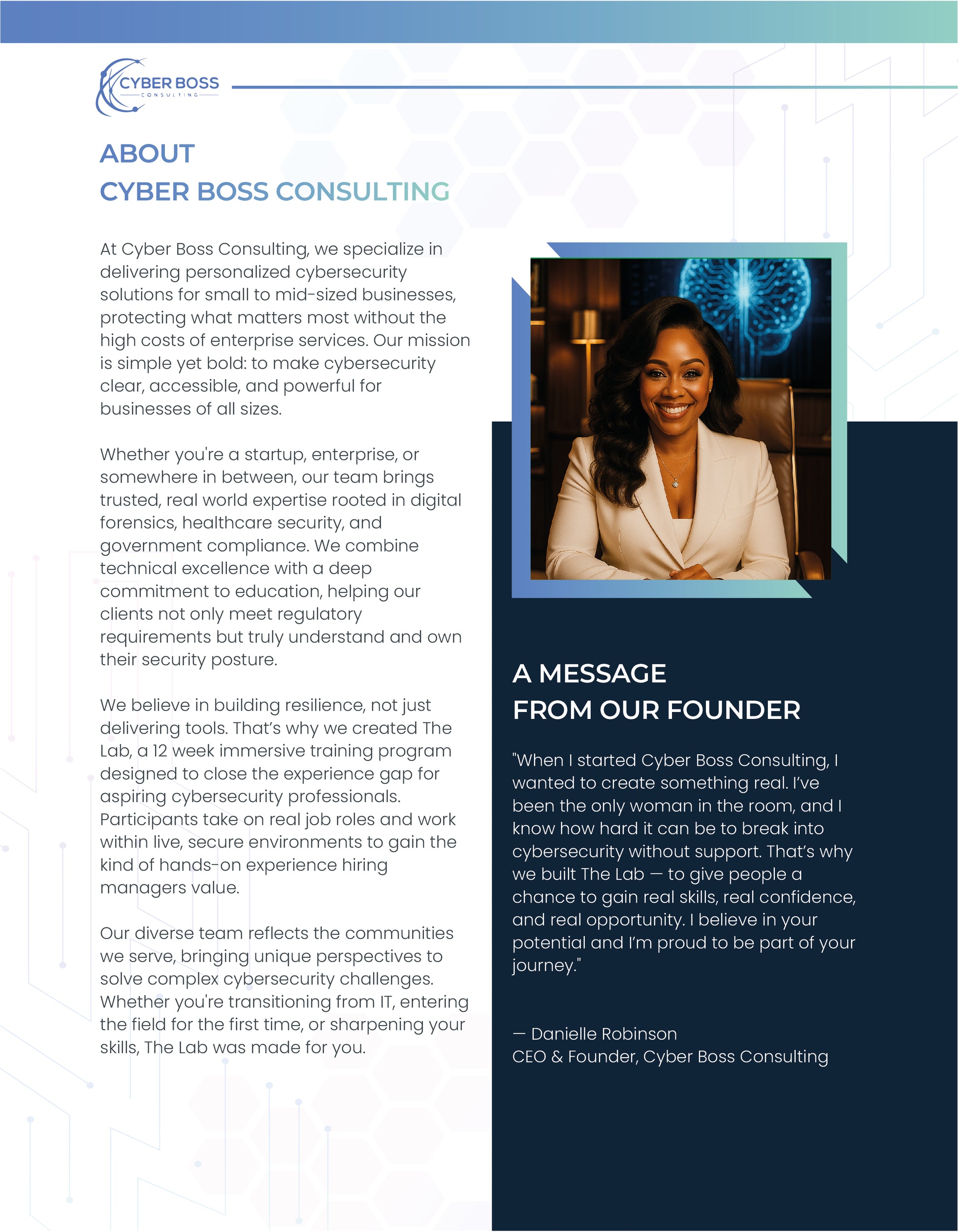 Get the full details on The Lab – Cyber Boss Consulting's elite, hands-on cybersecurity training program.